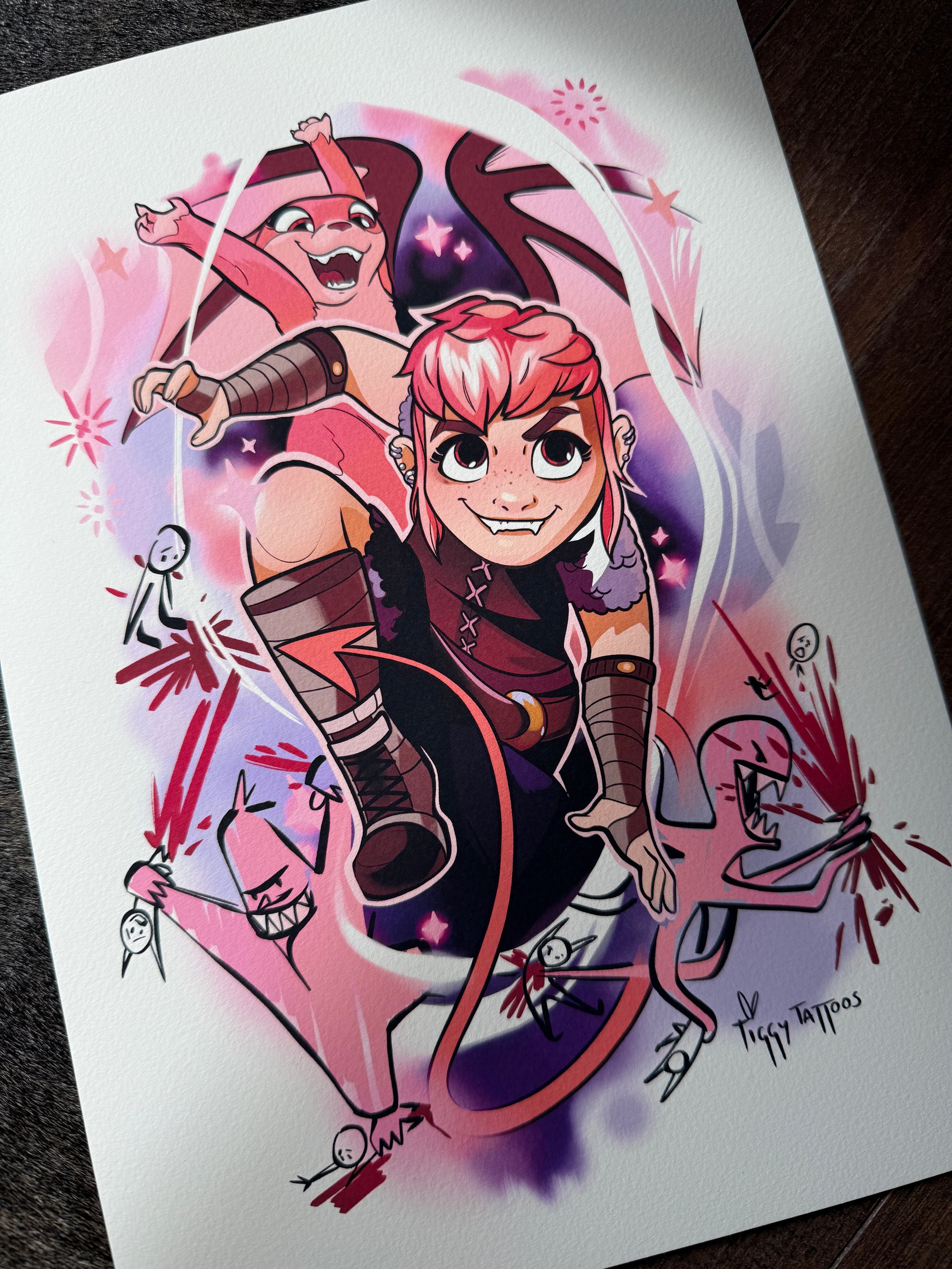 Inspired by the chaotic charm and unexpected tenderness of Nimona, this print is a little love letter to found family, rebellion, and shapeshifting weirdos everywhere.
